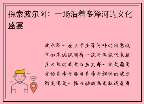 立即咨询如果说欧洲有一段河流能代表这片大陆的浪漫与历史,那一定是葡萄牙的多泽河。而与多泽河相伴的波尔图,更像是一幅流动的画卷,叙述着厚重的历史、独特的文化和无限的生活热情。